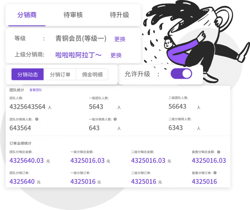 门店中心 用户端门店入口,输码扫码核销到店订单,统计订单等功能 | 门店管理 门店入驻、门店数据统计和筛选,后台辅助备货等功能 | 数据统计 订单实时统计并且实时查询订单排行榜,可随时进行数据对比 | 物流跟踪 对接快递鸟、实时获取物流信息 |